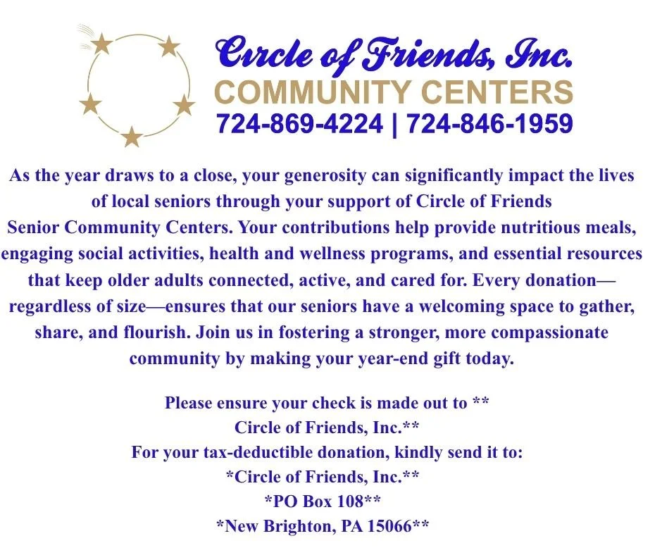 Circle of Friends, Inc. is a nonprofit agency dedicated to providing a collaborative, multi-faceted program in a community social center setting that maintains and enhances the independence, dignity, and quality of life of older residents residing in Beaver County and surrounding areas.